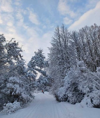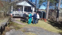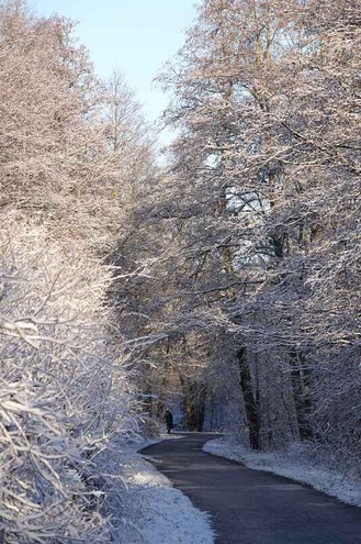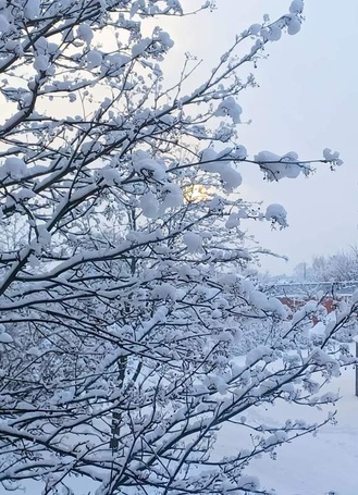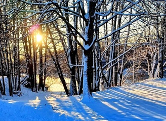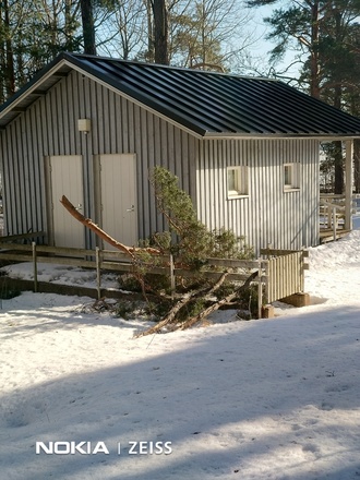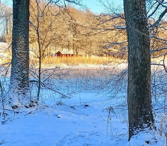 ![]() Mehun majalla lumi ja tuuli tehnyt tekojaan. Kuva Esko Rantasalmi | ![]() Auringonpaiste lumikuuron läpi. Kuva Ritva Hanski |