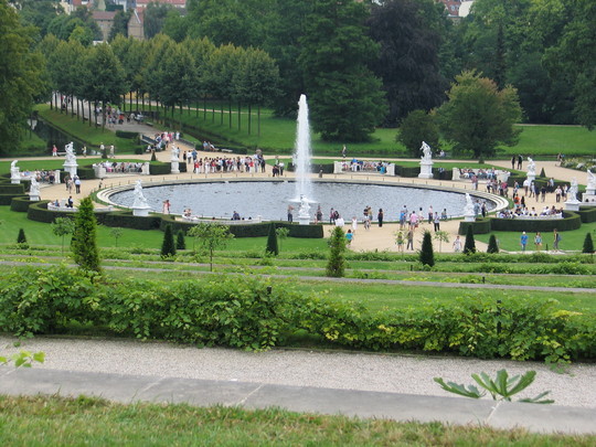 ![]() Schloß Sanssoucin rakennutti Fredrik Suuri rokokoo-tyyliin. Puutarhanpuoleinen julkisivu on 97 metriä leveä. Kattoa ja kupolia kannattavat 35 isoa karyatidia (naishamhoista pyvästä). Linnan edessä on portaittain viiniköynnöakaappeja. Naisilla, ei edes narttukoirilla, ollut Sansoussiin mitää asiaa. Kuninkaan lempikoirien vapaa liikkuminen oli varmistettu oviin rakennetuilla koiraluukuilla. Linnan sisäpihalta laskeudutaan viiniköynnöskaappien ohi leveitä rappuja veistoksin koristetulle suihkulähteelle. |